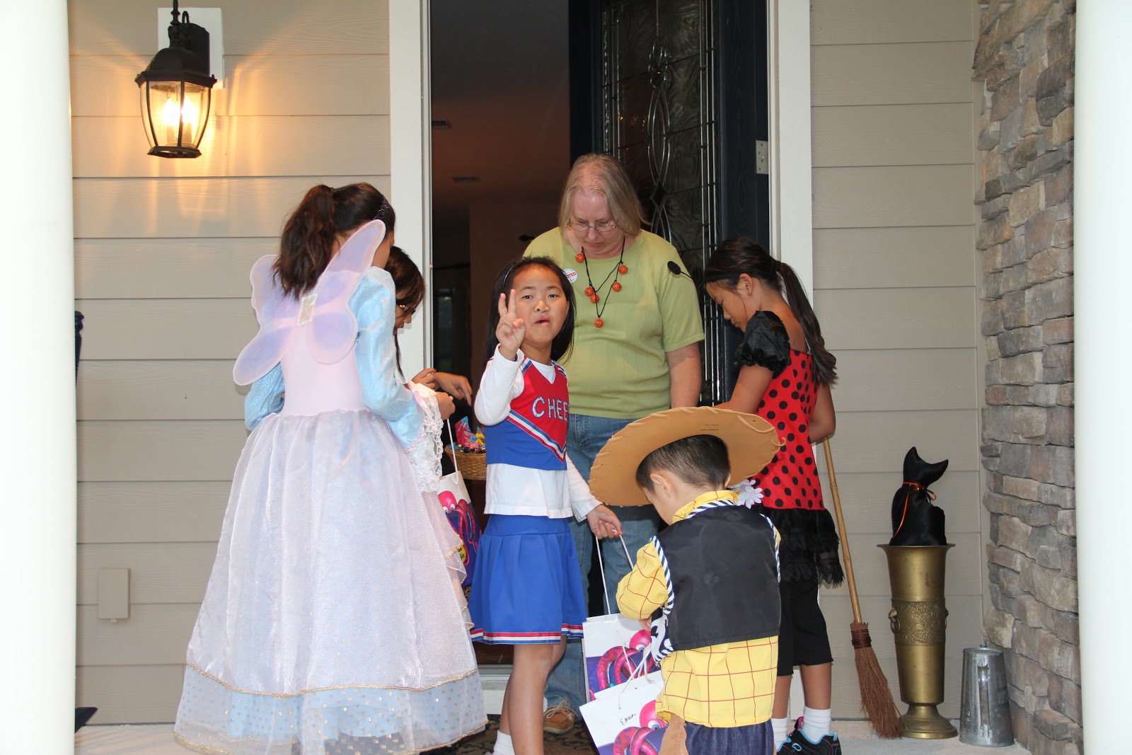The girls dressed up in costumes that we had. They did not care that we did not buy them new ones. Because these were new to them. They did not question us to why they were dressing up. They just did it. Then we explained that they say "Happy Halloween", "Trick-or-Treat" and then "Thank You". They were excited. The smiles on their faces were priceless. We walked our neighborhood for 2 hours. Besides the phrases above, they also kept saying "WOW!!!!!" when they would look in their bags.